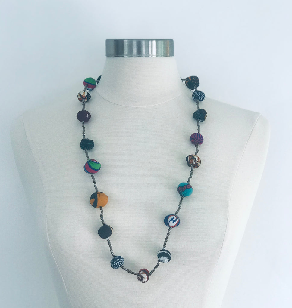 36” African Kanga colorful fabrics make this necklace slightly longer with Gold seed beads bringing it together. No two necklaces are the same.