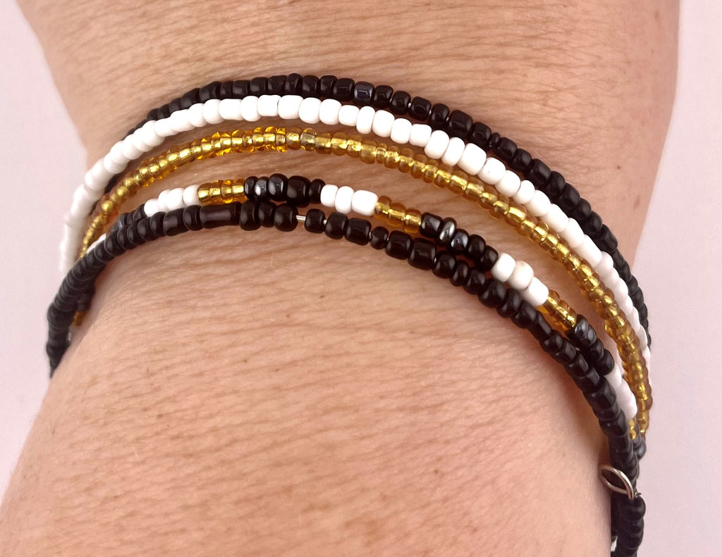 Black, White & Gold Seed Beads in a 6-wrap Coiled Bracelet. Wear it alone or pair it with our Beaded Necklace Black, White & Gold and our Cascading Earrings in our Collections.