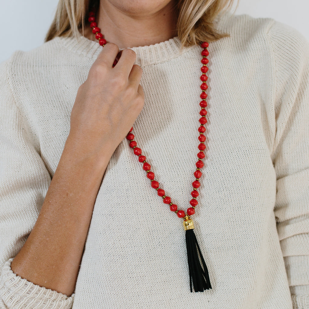 Hot Red Paper Bead & Black Leather Tassel Necklace