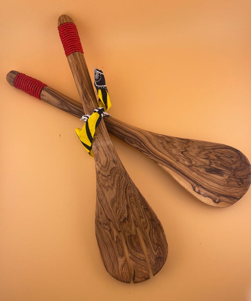 Hand-carved Olive Wood Spoon Set with Red Seed Bead Handles