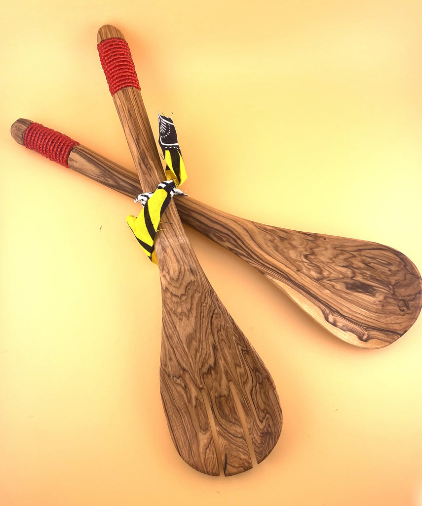 Hand-Carved Olive Wood Spoon Set with Red Seed Bead Handles.