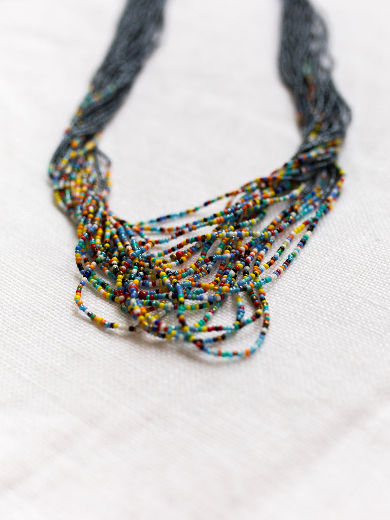 Grey Seed Beads & Multi Seed Beads cascade to make this beautiful rendition of a Maasai Tribe Ceremonial Necklace indigenous to Kenya and Tanzania.